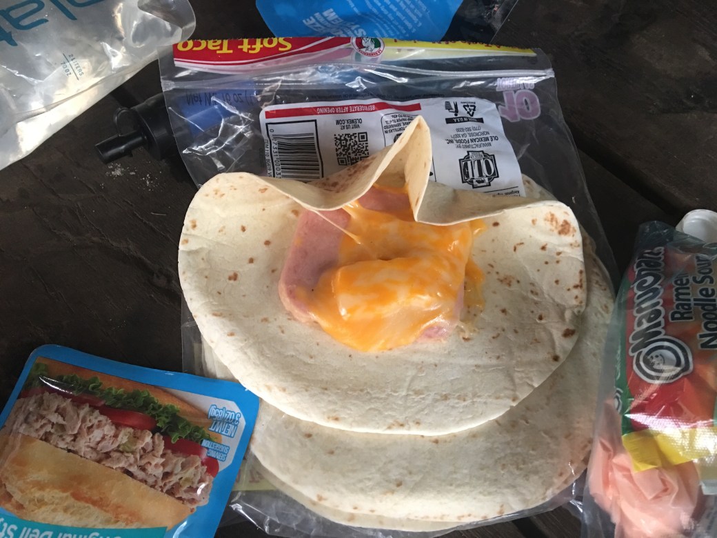 I was chatting to a father and son from Gainesville who were thru-hiking, Beanbag and Pyro. Pyro cooked my ham and cheese which I wrapped in a tortilla. It was great. Spam is good, cooked spam is better. Cooked spam and melted cheese is hiker heaven. I also had a tuna wrap and noodles for dinner and could have eaten more.
