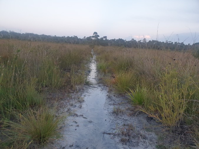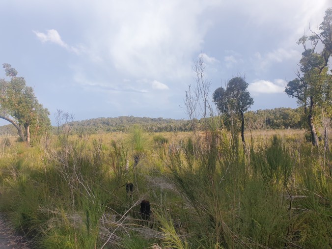 The track continued on the sand super highway for a good long, stretch and then it was back into the Pingerup plains. The plains were quite beautiful with heathland, reedy open swamps, karri and jarrah hummocks, lots swamp banksia, scrub and the occasional granite outcrop here and there. There was not as much water on the trail as I was expecting, the plains are notorious for being waterlogged in winter and with the rain we had had I was expecting some swimming might be required, but it wasn’t too bad at all.