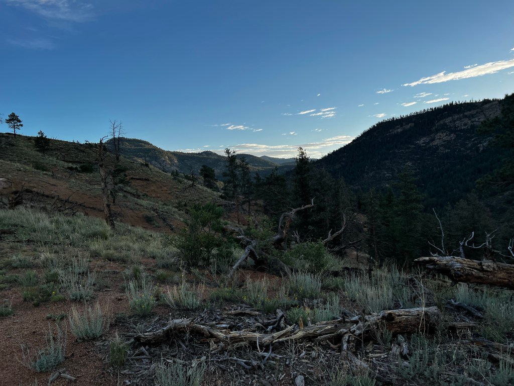 There are two large areas of this segment that were burned years back, so there is no shade. And there is no water. It’s essentially a desert. I hit the first of those sections as the sun starting powering up for the day. It was already getting hot and I was already smashing my water. It was at this point I began to realise I might not have enough water. I tried to ration it, but I was beyond thirsty. The heat demanded I drink. It got to the point where I considered turning around and heading back to the river. The main issue with that, was there was no easy way from that trailhead to a town. It would mean miles and miles of road walking.